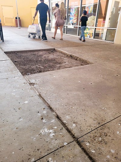 Along the walkways, there are these dirt squares that could have been for plants because I noticed a sprinkler head. In my opinion, a hazard for pedestrians. Someone could get hurt.